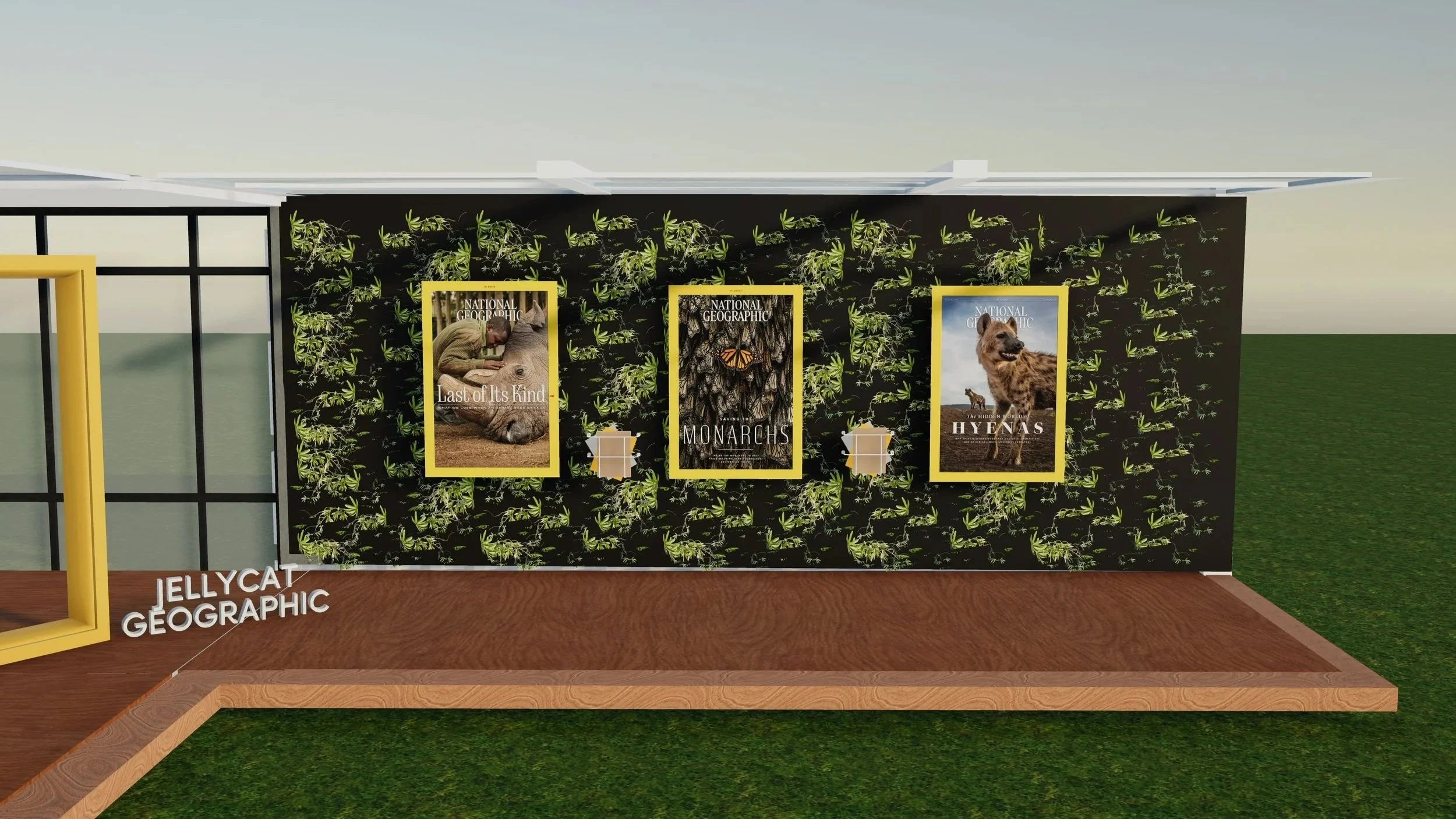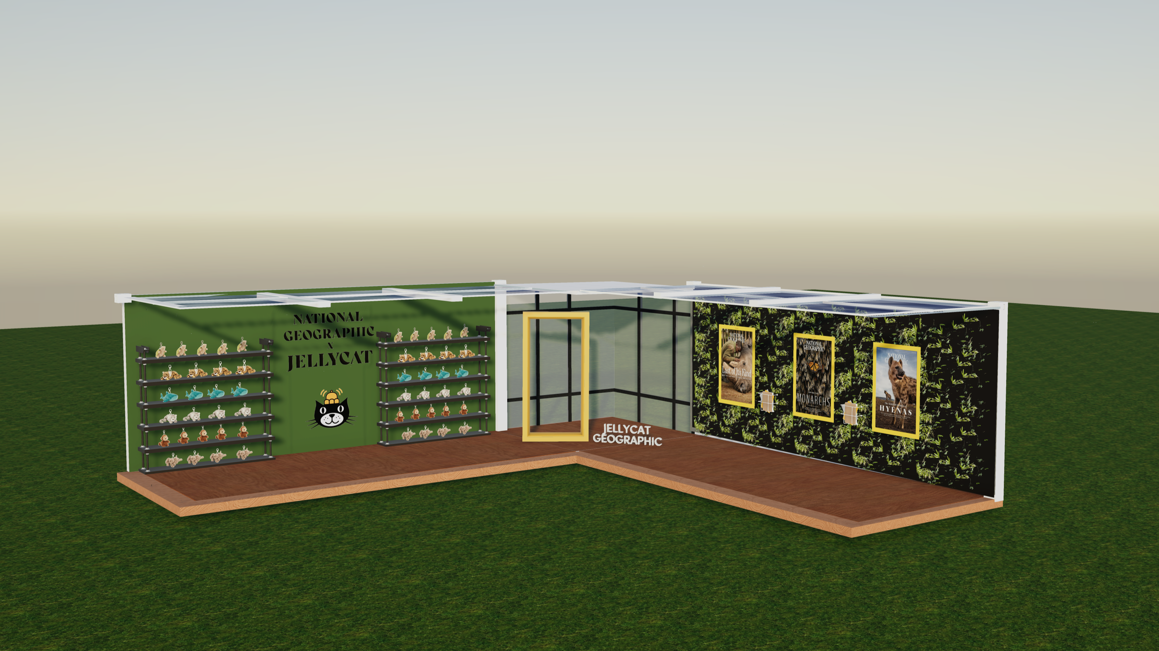 The pop-up shop for a collaboration between National Geographic and Jellycat combines brand ethos to launch a new product. Typography, color palette, and materials are created by combining each brand’s visual styles. The goal of this pop-up is to raise awareness for endangered species through brand promotion.